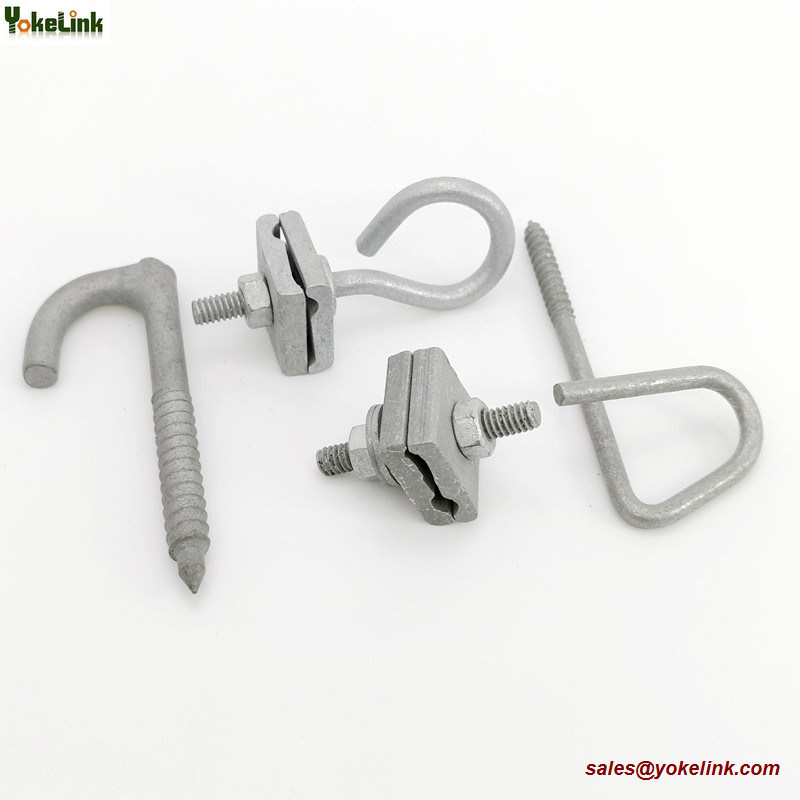 Cable Lashing Clamps used in CATV and telephone aerial construction to secure terminating lashing wire or ground wire to a separate strand. There are two types D type Cable lashing wire clamp and E type Cable lashing wire clamp. Yokelink D cable Lashing Clamp clamp has two separate clamping plate pieces, and is composed of a stud, two Washers, and two bug Nuts, Lashing clamps ensure bug nuts are tightened and the lashing wire itself is terminated properly. A mechanical galvanized finish provides extra corrosion resistance and safety against weather.